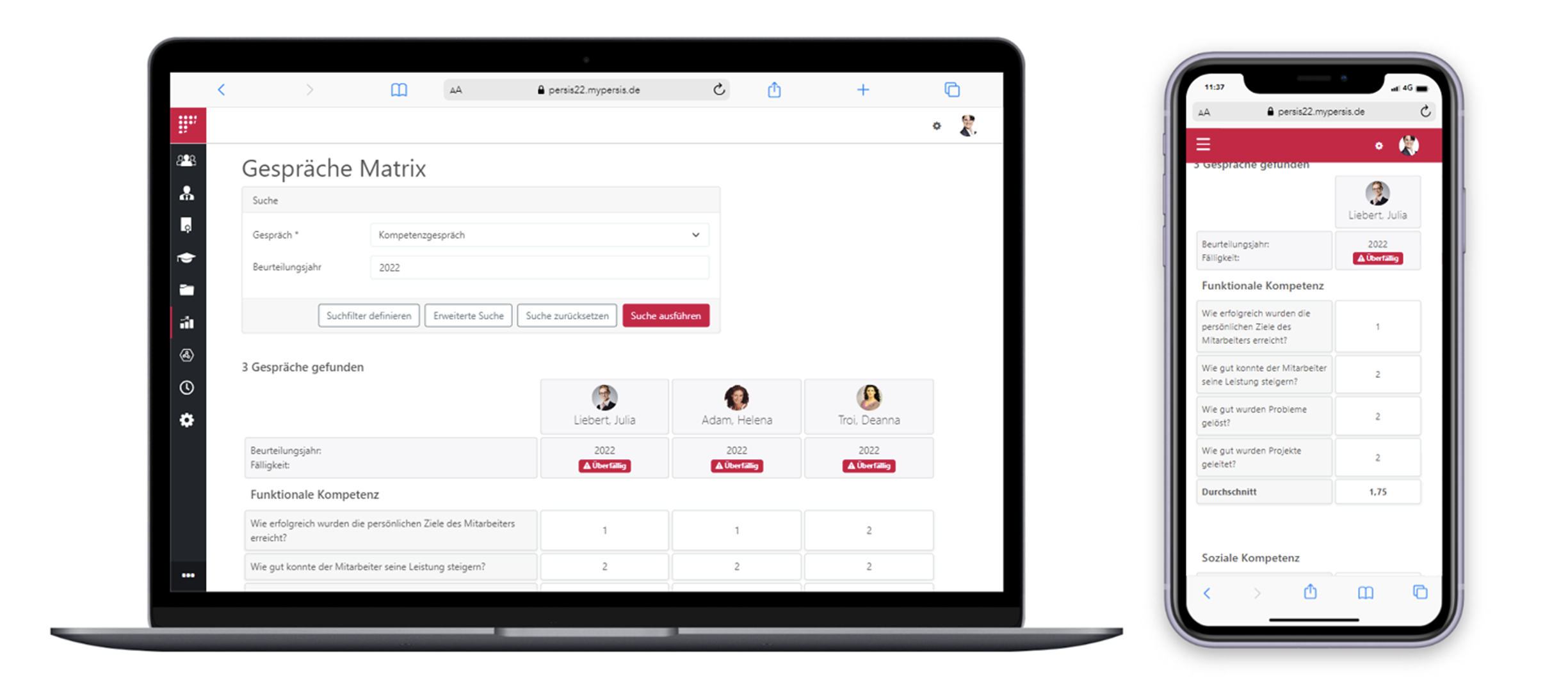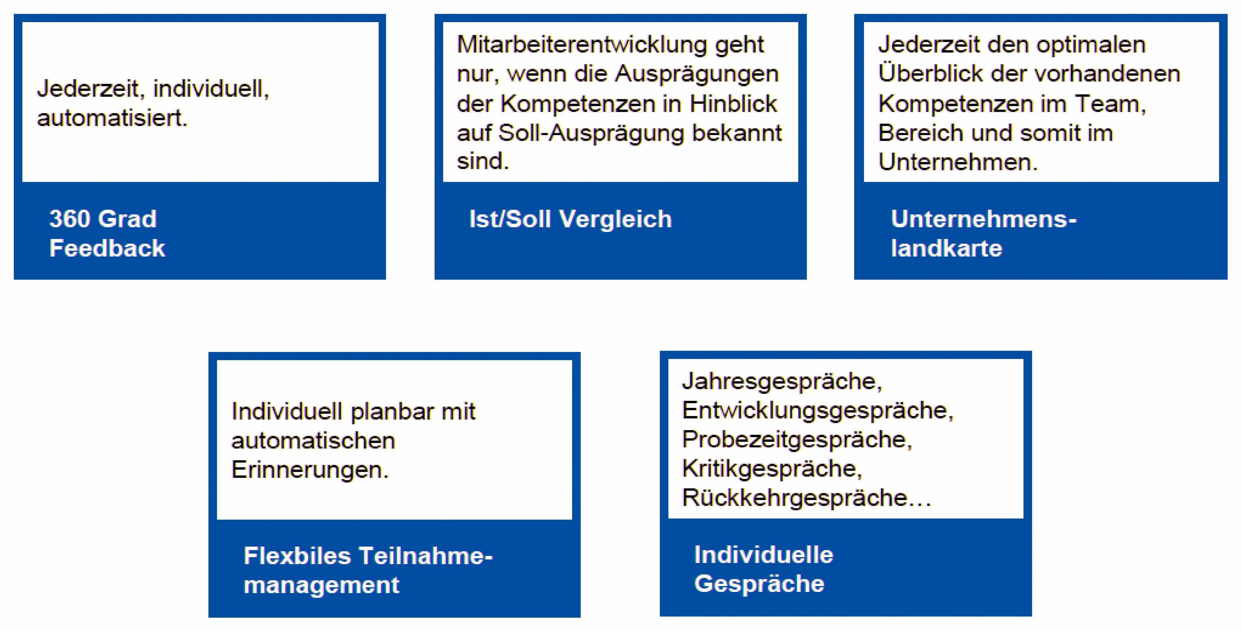 Nachdem den einzelnen Stellen/Rollen die Soll-Kompetenzen zugewiesen worden sind, kann für die Stelleninhaber oder Nachfolger eine beliebige Beurteilung bis zu einem 360°-Feedback durchgeführt werden. Die PE-Abteilung hat eine direkte Übersicht über alle Prozesse und Ergebnisse.