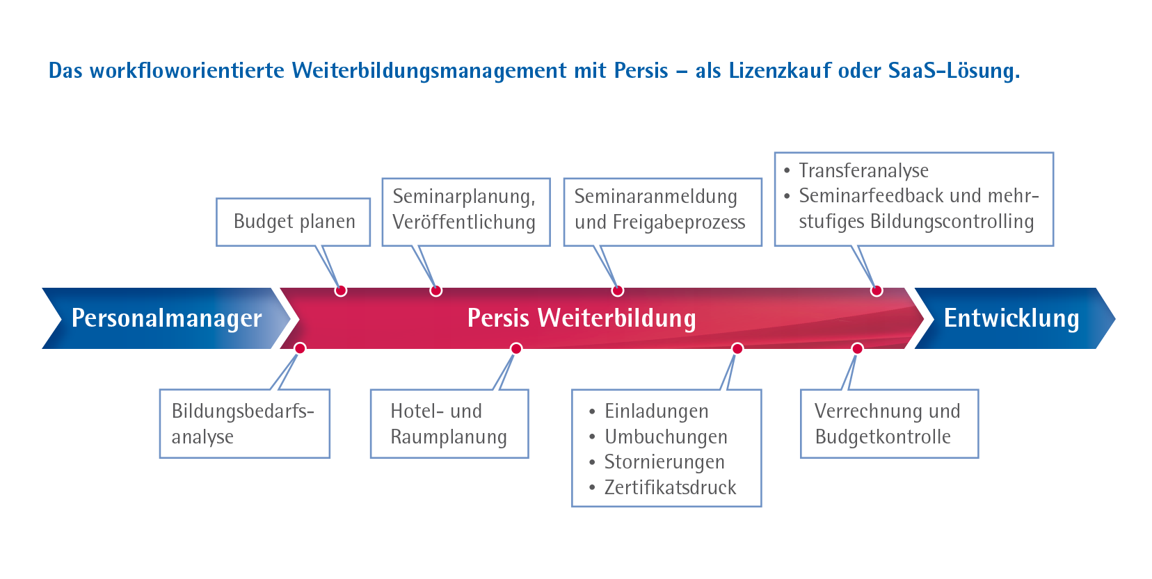 - Durchgängiger Prozess von der Anmeldung über die Genehmigung bis hin zur Erfolgskontrolle.